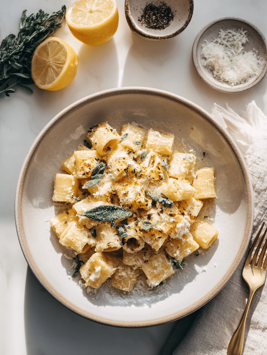 The magic of ricotta & lemon mezzi rigatoni really comes down to starting with the right basics. Whole milk ricotta is a must it gives you that rich, velvety texture. Fresh lemon is non-negotiable, both the zest and juice. That brightness is what makes the dish feel alive. Don’t forget to reserve a bit of pasta water it helps turn everything into a glossy, clinging sauce that wraps around every bite.